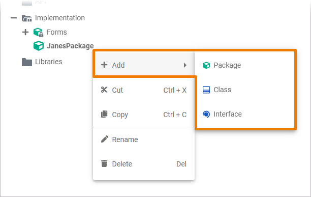 You can add your own data model in newly created packages now. But some content is also added automatically to the Implementation folder: The package Forms is a generated package. This package is locked - you cannot change the generated form classes. If you create a form, a corresponding class is automatically created in package Forms.