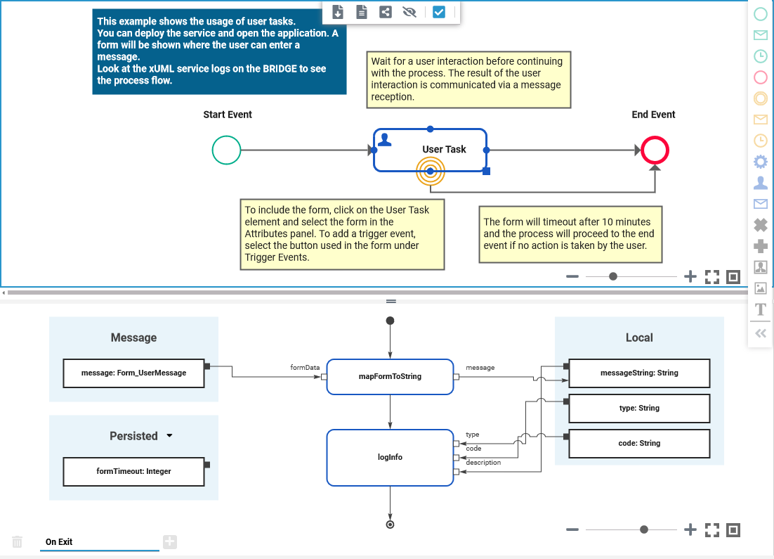 On Exit | This execution is performed in the exit behavior of the related process state, once the message containing the form data has been received. It gets the form data as a parameter, and you can persist it to have access to the contents later on in the process. |