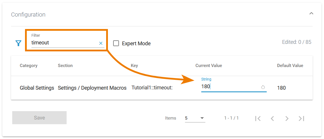 When the service has been deployed successfully, use option Administration in the deployment controls to open the service details in the PAS Administration. In the details view of your service go to section Configuration and use the filter to search for the value you want to change: