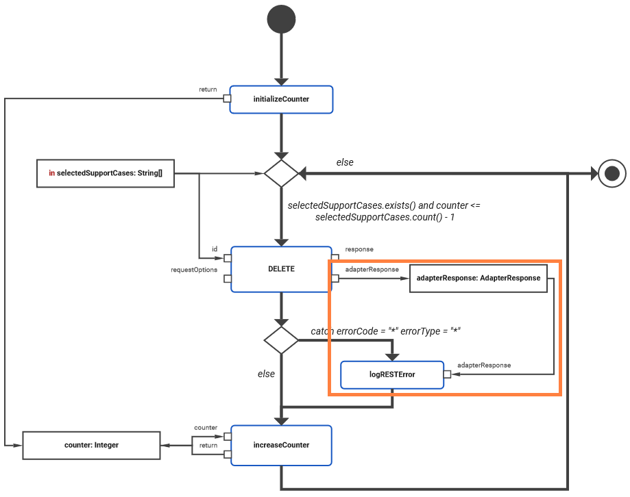 Look at the activity diagram below. It shows the implementation of closing all selected support cases. If a support case cannot be closed for whatever reason, an error message is logged into the service log.