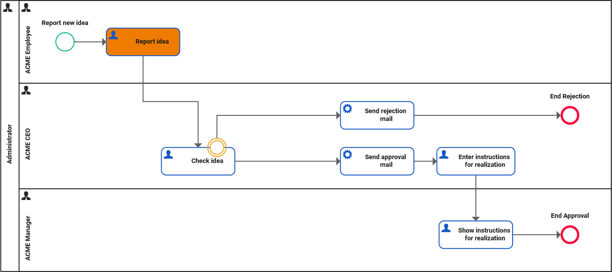 If Irene rejects the idea, a rejection mail is sent and then the process is finished. If she approves the idea, an approval mail is sent and the process step Enter instructions for realization is automatically initiated. Again, only Irene in her role as ACME CEO is involved in this process step: