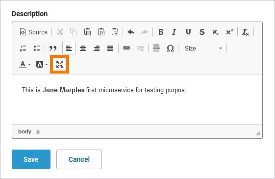 Click into the editor section and start typing. Various formatting tools are provided. If you want a better overview while working on your text, you can maximize the description editor. Use option Maximize to show only the editor's content in the current browser tab: