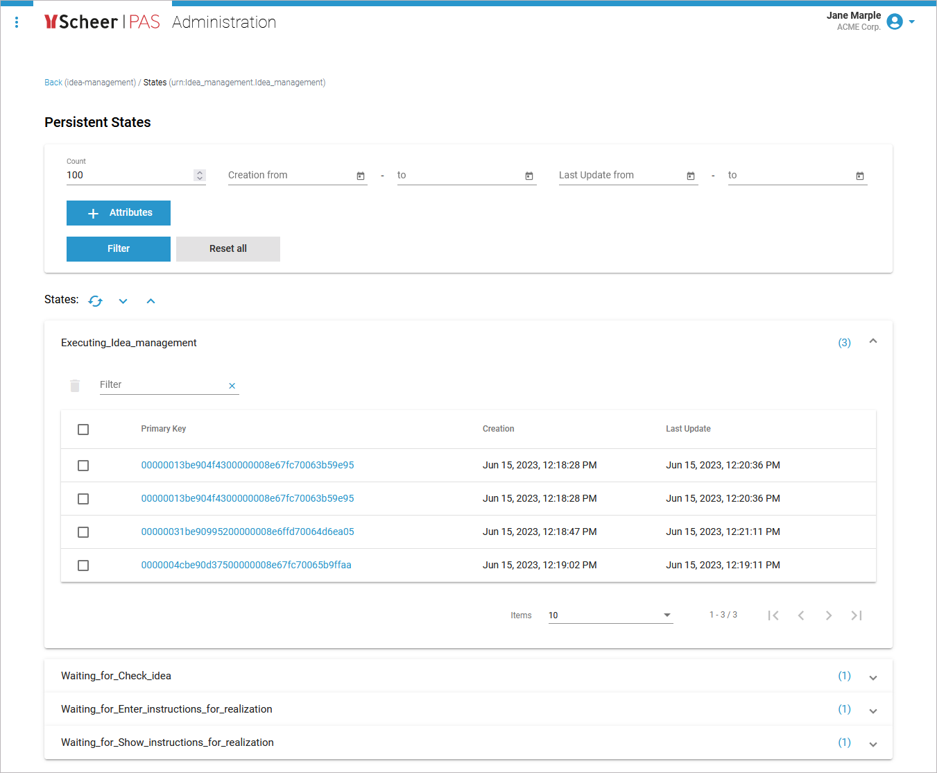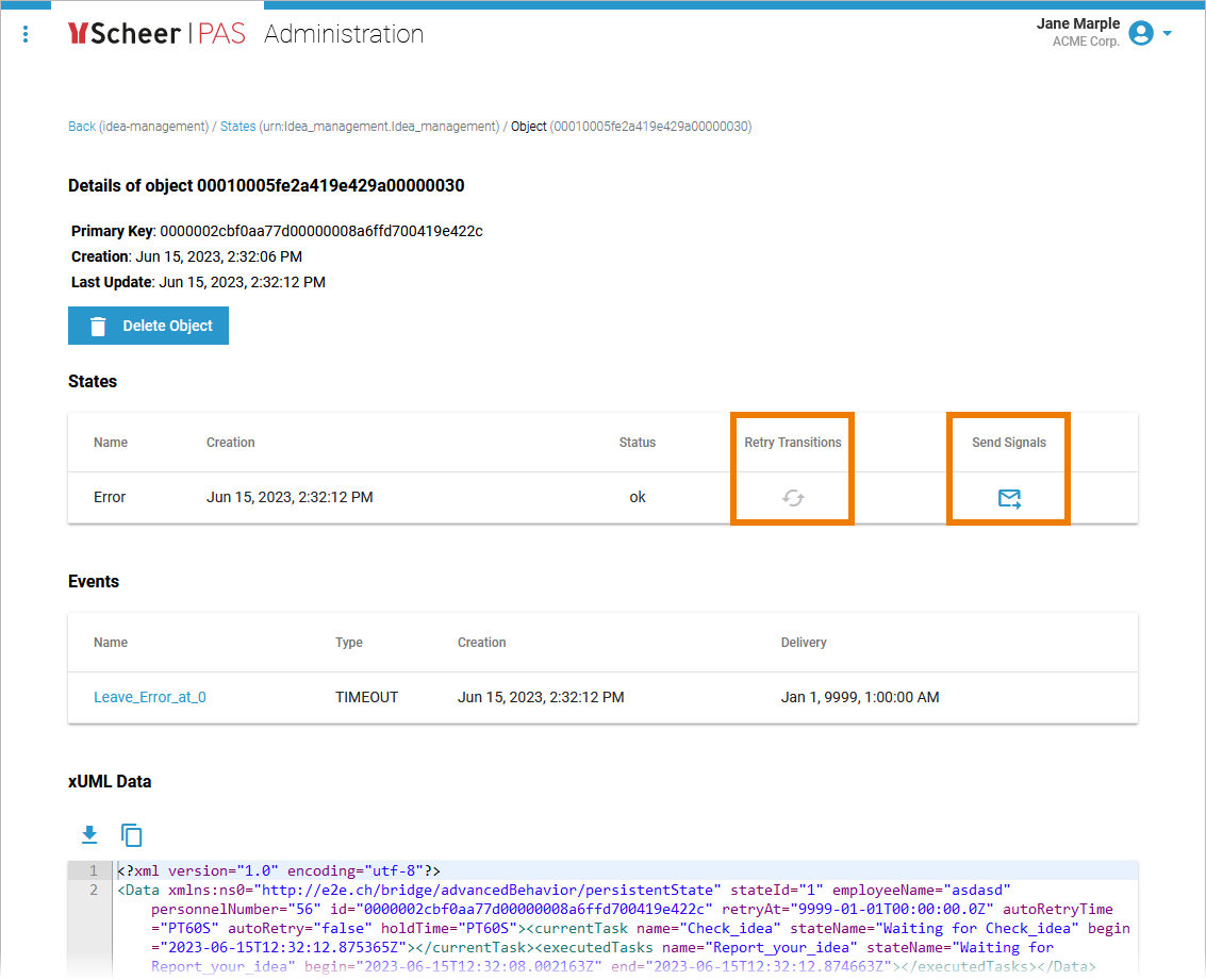 In the details view of a persistent state object, you can inspect the process and state details, trigger available signals or a retry via the corresponding icons: