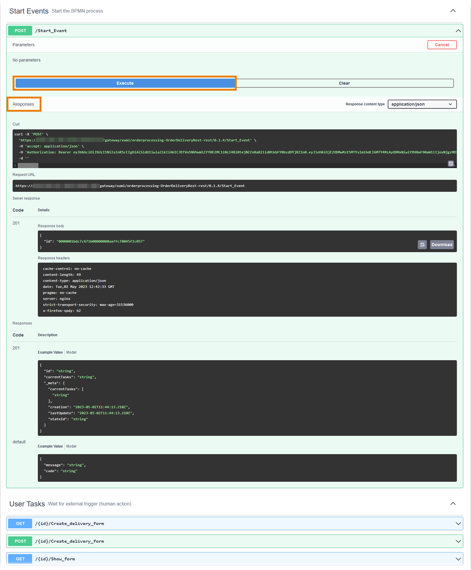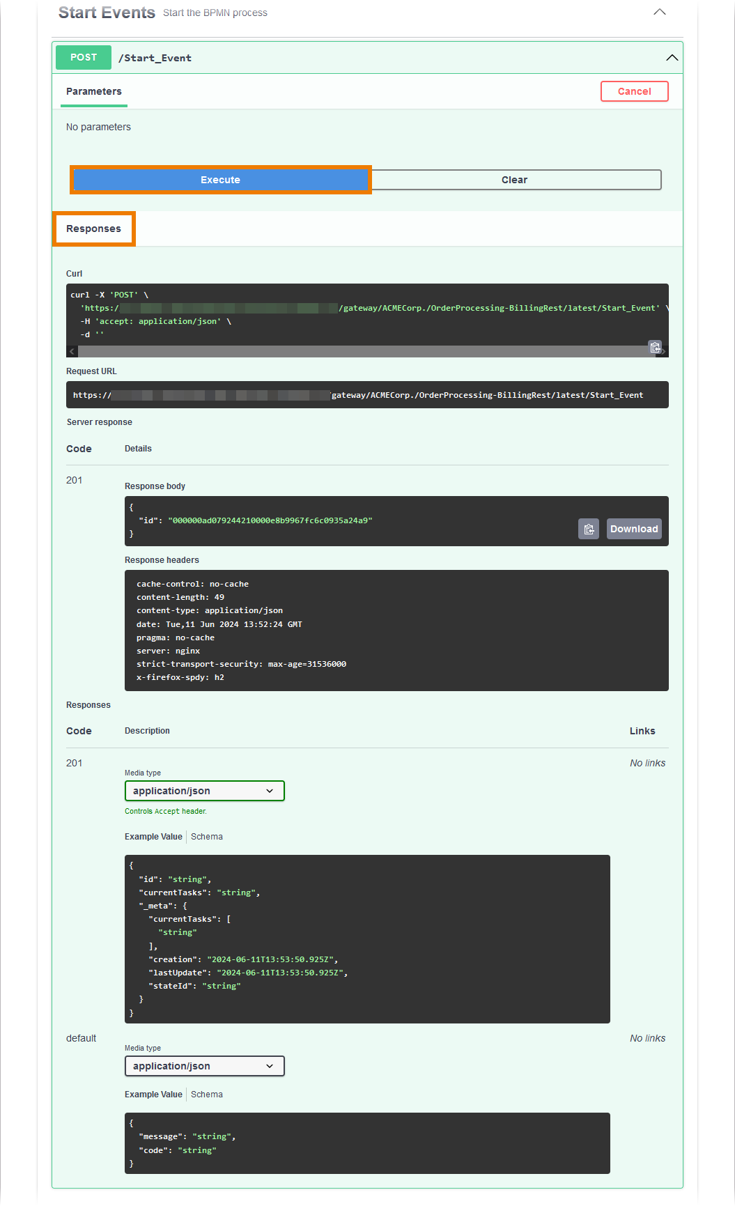 Expand the REST operation to see the necessary parameters. To start testing, enter the required data and click Execute. Scroll down to check the test responses: