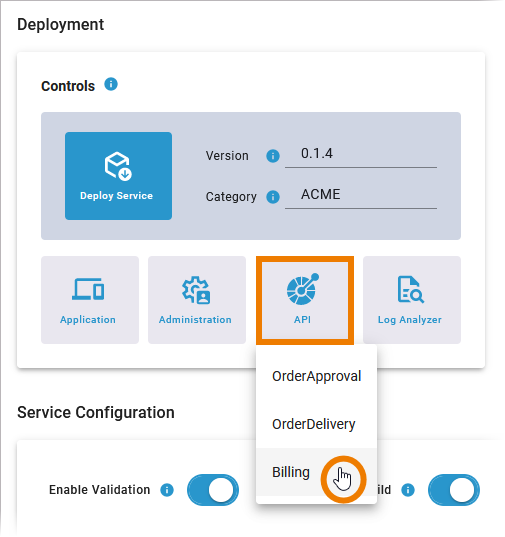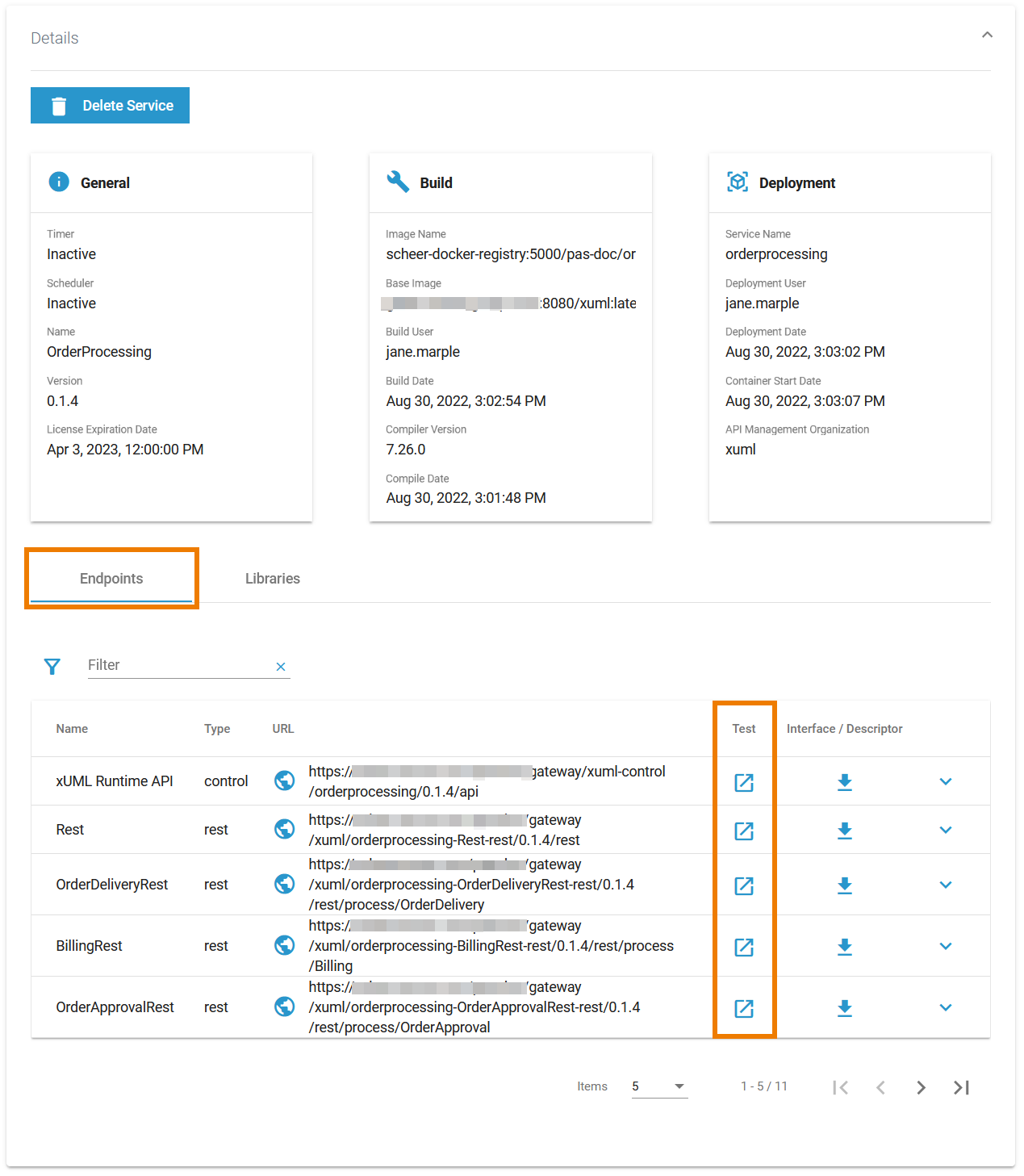 For services that have been deployed as container, you have access to the test UI via the PAS Administration: | For services that have been deployed to the PAS integration component (Bridge), you have access to the test UI via the API Management. To test a service in API Management, you have to make sure that the service settings are set correctly before you start the deployment. The settings are different depending on whether a service has a user interface or not: |