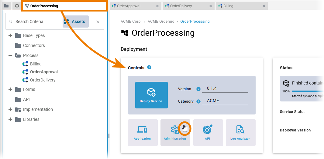 When the service has been deployed successfully, click Administration in the deployment Controls. This will open the details of the service within PAS Administration: