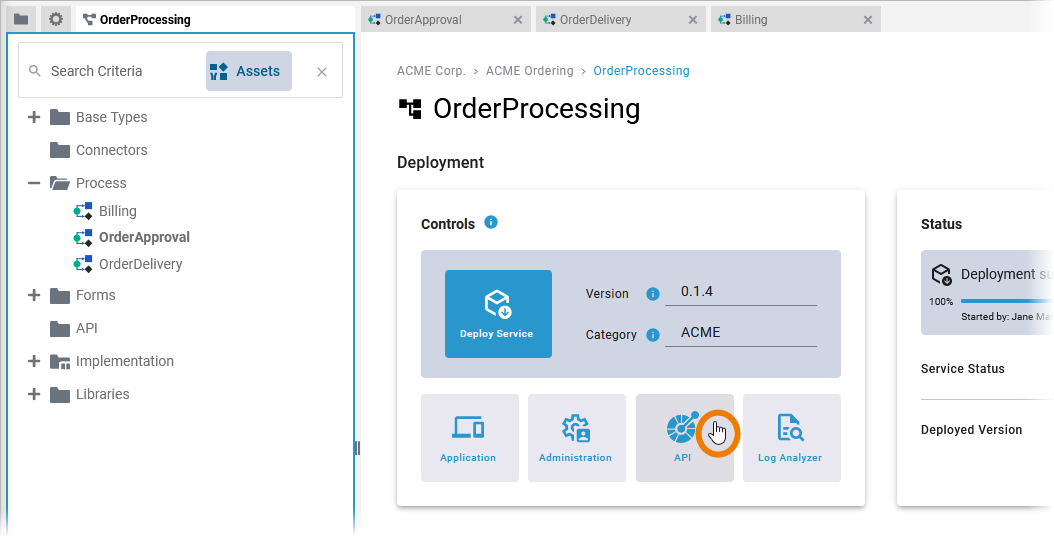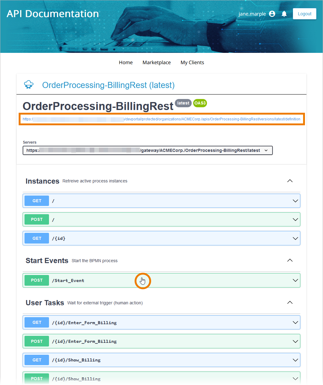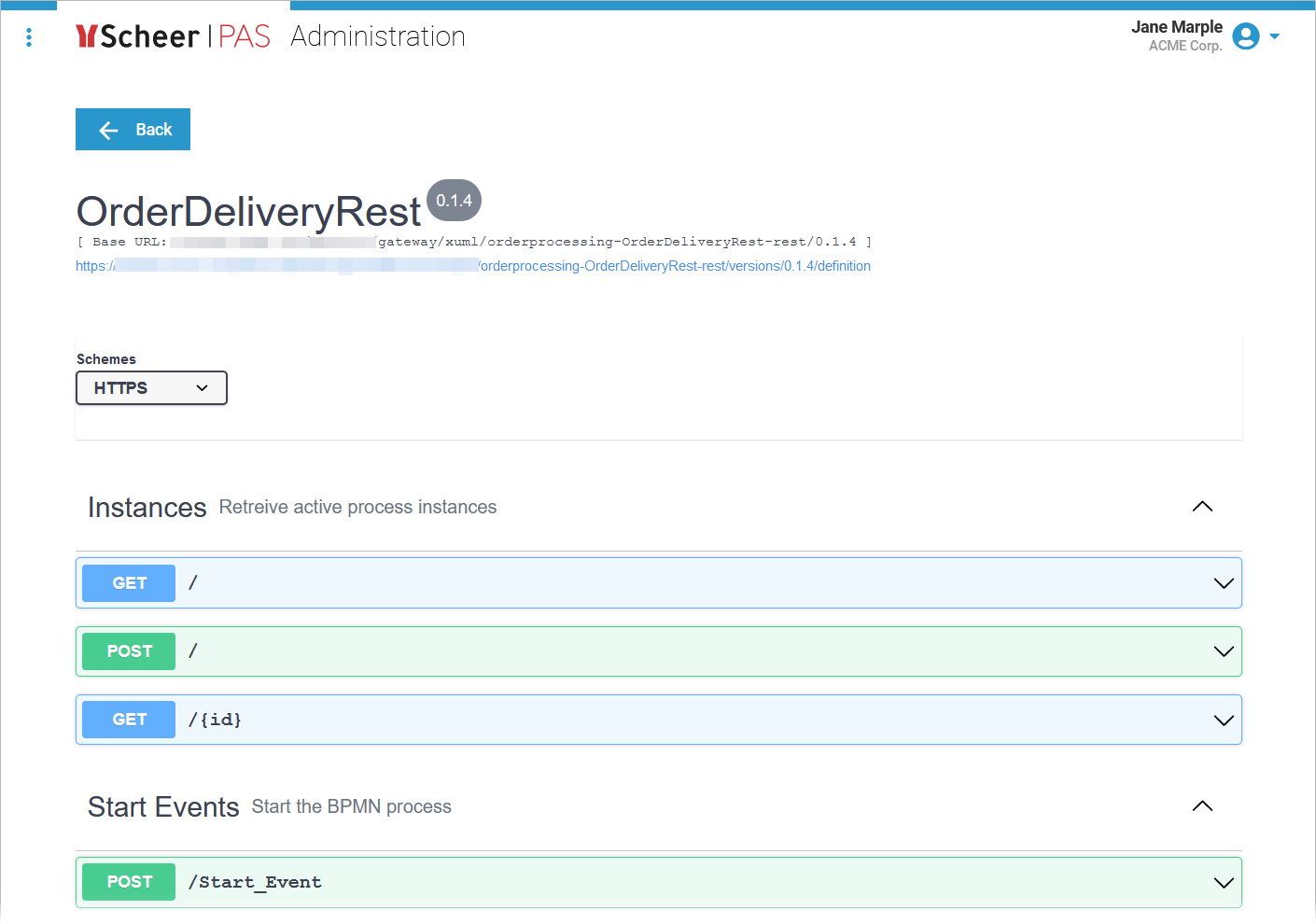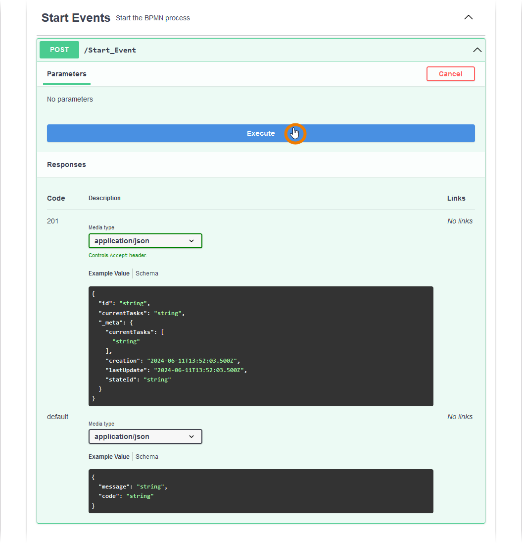When compiling a service from the Designer to a deployable repository, a REST service is generated from each BPMN model. Depending on your deployment target, you can test this service in the PAS Administration or in API Management.