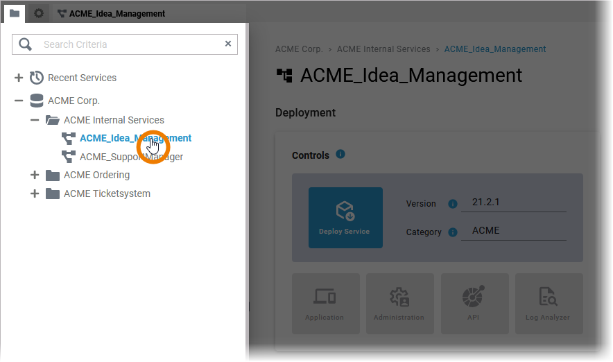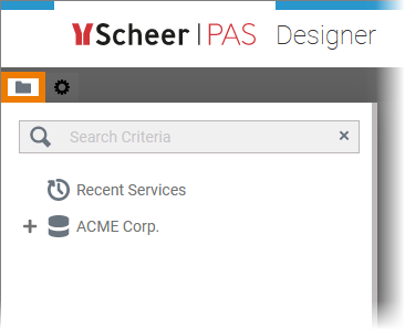 In the explorer tree, you can find all namespaces that have been assigned to your user. Use the tree to create new folders and services. You can search the tree content using the search field (refer to Searching in the Designer for detailed information).