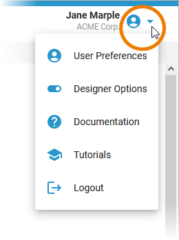 On the right side of the Designer header you can find the header menu. Use the menu to access further functionalities of the Designer: