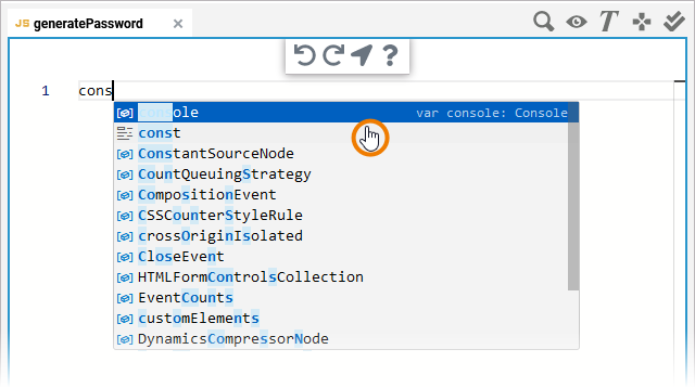 To create a JavaScript statement, start by typing JavaScript syntax. All available statements matching your input are listed. You can also select one of the listed statements to use it: