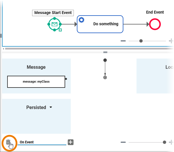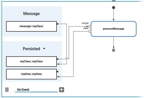 The execution model (On Event) for a message start event is created by default to process the message parameter:
