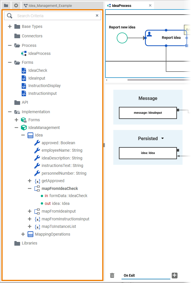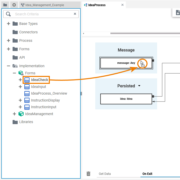 Example: The type of the selected class IdeaCheck is applied to the incoming message.