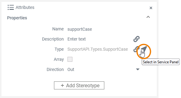 Select an element in the Service panel to display the corresponding attributes in the Attributes panel. By clicking Select in Service Panel the focus jumps to the corresponding type in the service panel, and the related details are displayed in the Attributes panel: