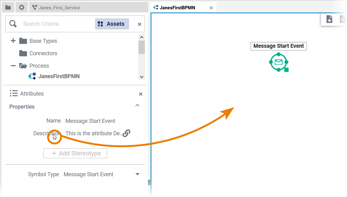 It is possible to display the attributes of a BPMN element on the diagram pane. Click on the name of the desired attribute and move it to the diagram pane using drag & drop: