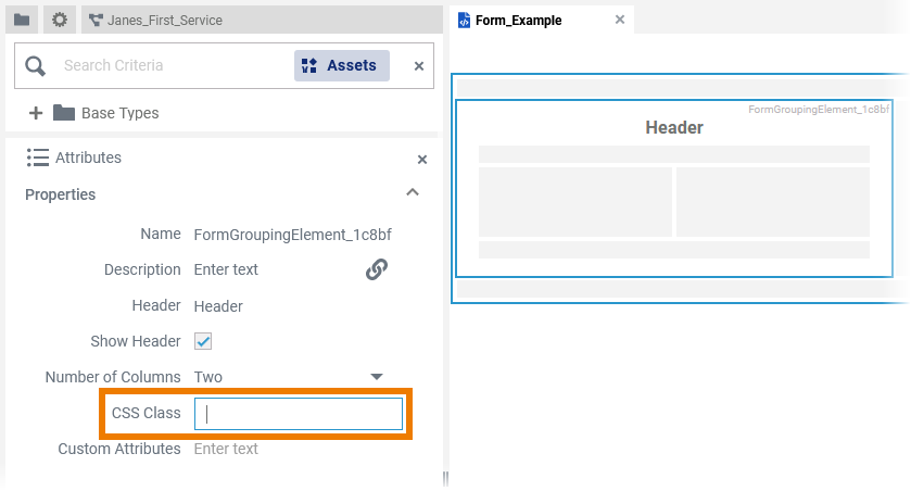 The attribute CSS Class allows you a field-accurate layout customization of the grouping element. To do this, you must enter a valid CSS class: