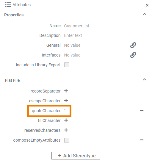 To enclose all string values in the file with double quotation marks, the character " is specified as the stereotype attribute quoteCharacter on class CustomerList.