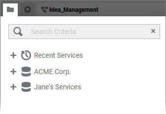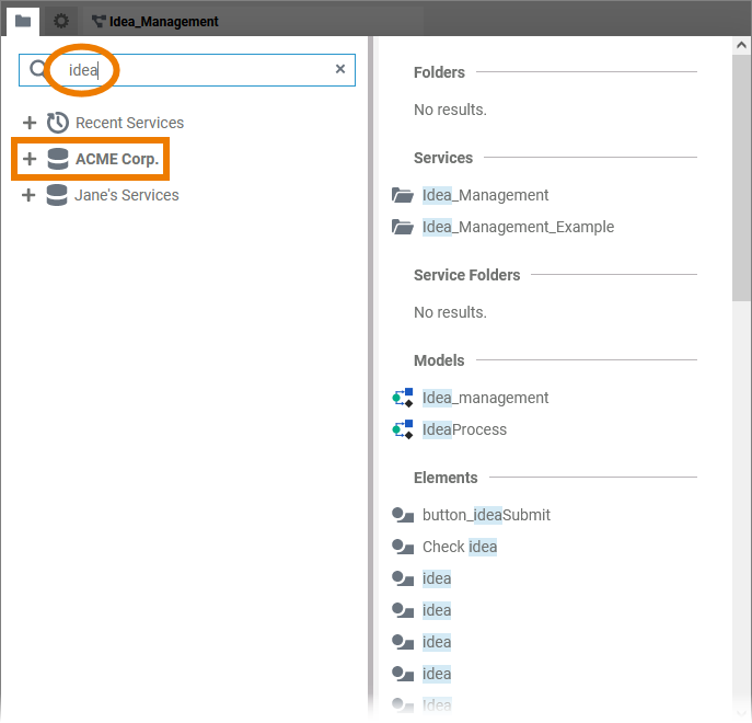Click into the search box and enter your search term. While typing, the service tree is filtered automatically. Only matching elements are displayed and the hits are highlighted in the tree. Up to 100 hits can be displayed in the service panel. If you search criteria match more than 100 items, a note is shown below the search box. In that case, refine your search: