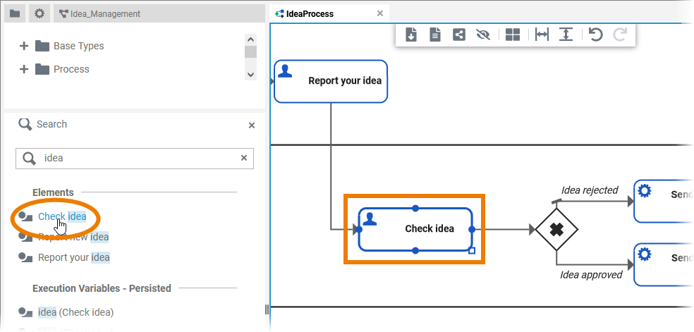 In the BPMN editor, click on a match in the list to focus the element in the BPMN diagram: