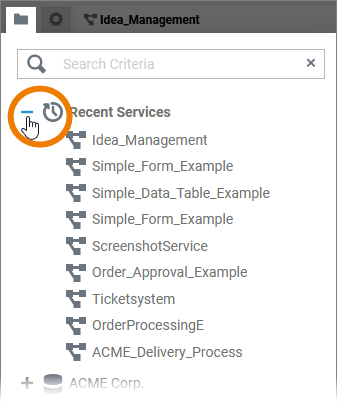 The list shows the last ten opened services. Click a service in the list to open it in the background.