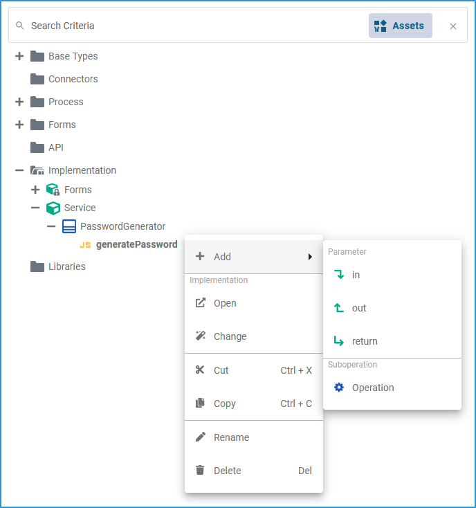 When creating class operations to your own data model in the Implementation folder, you can select from the following different types of implementation: