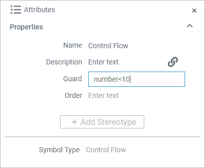 To add a guard expression to a control flow proceed as follows. Select the control flow you want to add a guard expression to from the activity diagram and open the Attributes panel: