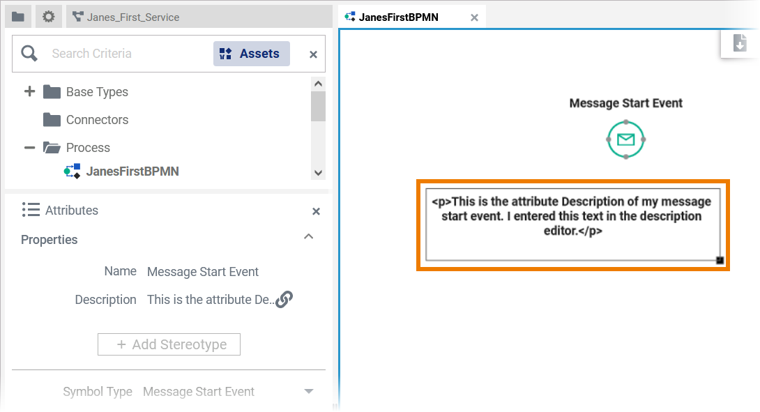 Description | ![]() | If you want to insert a description for your element, click here to open a text editor where you can enter and format your text: ![]() | All BPMN elements. |