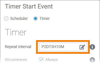 Timer | ![]() | Attribute Timer is only available for the Timer Start Event. Hover over the timer settings to display a detailed settings view: ![]() To define the timer settings, click Open Timer to open the timer editor. For detailed explanations see How to Use the Scheduler/Timer. | |
