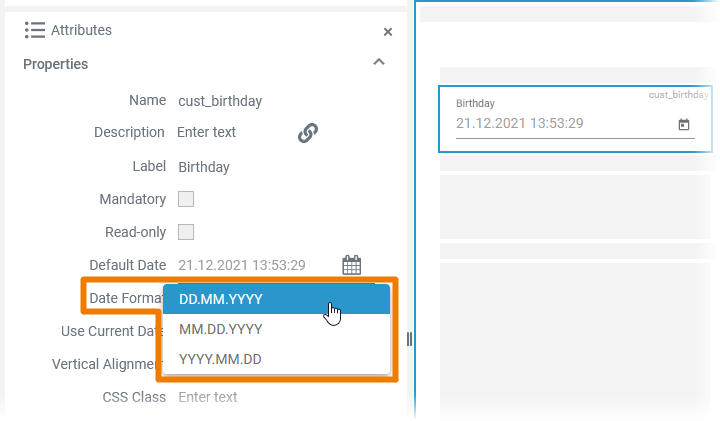 Use the Date Format field to define the format, in which the date shall be displayed. You can choose between three different date formats:
