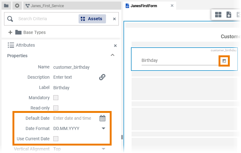 Use the calendar icon in the element or in the Attributes panel. The selected date will then be displayed in the form field.