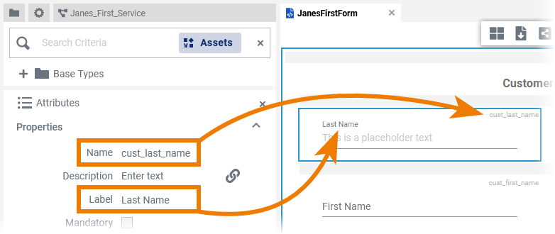 Name: This is a technical identifier that is not shown to the user. During modeling in the form editor, it is displayed on the top right of each element.