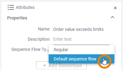 Particularity | An exclusive gateway can have one outgoing flow that is marked as the Default sequence flow . This is the flow of the process that will be followed if all other conditions do not match. The default flow is marked with a slash on the relation: ![]() You can mark a sequence flow as to be the default in the Attributes Panel: ![]() |