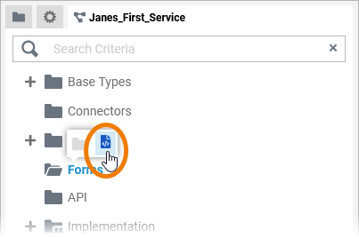 Forms are managed within a Forms folder. To create a form, hover over the Forms folder in the service panel and use option Add Form: