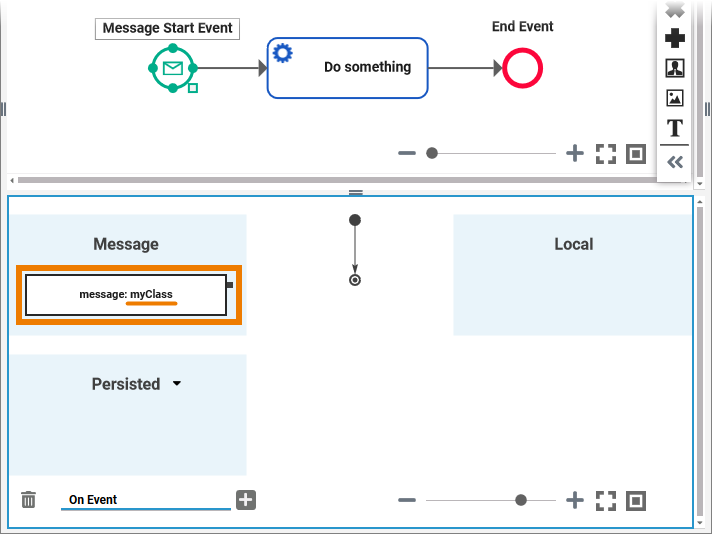 The execution model (On Event) for a message start event is created by default to process the message parameter: