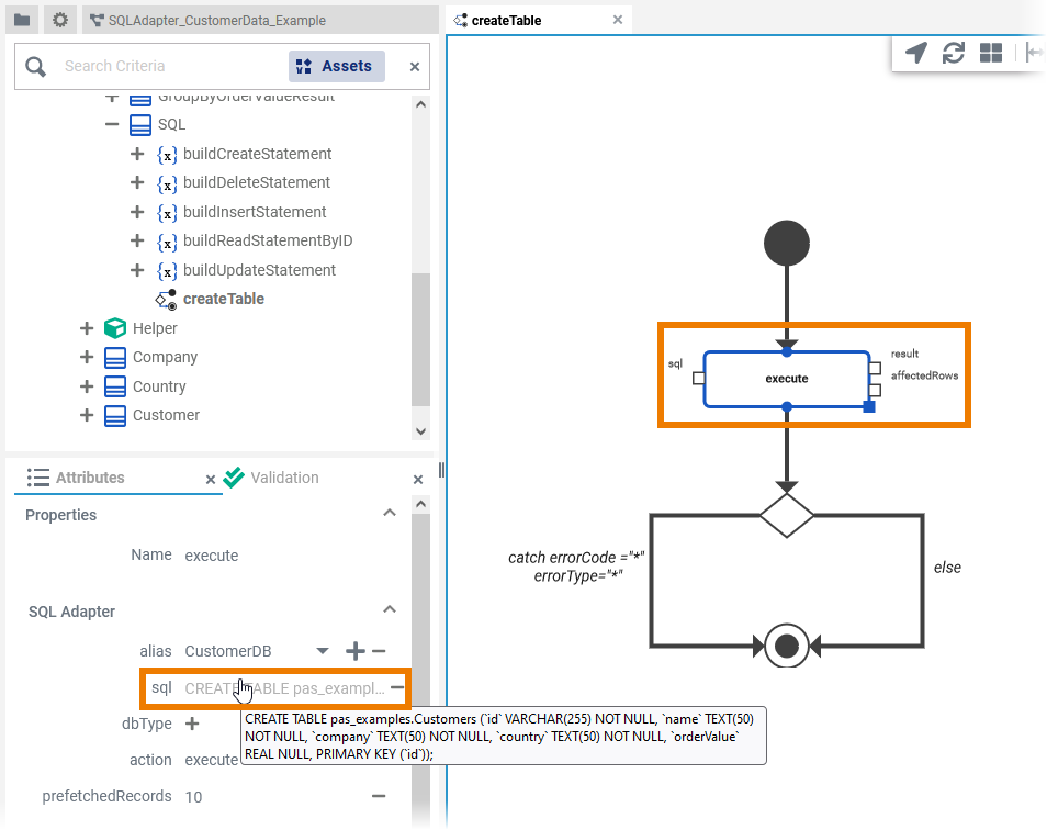 In the example below, the execute operation will access the database that is associated with the alias CustomerDB. In the attributes panel attribute sql allows to enter an SQL script, which in our example creates a new table to the associated database. The resulting output of the query is returned to the caller via the result pin if there is any.