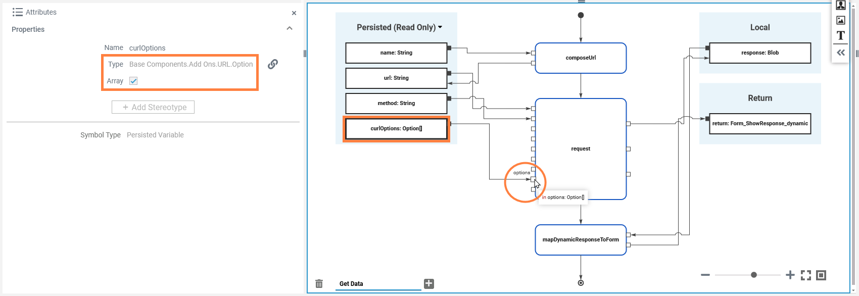 Persisted variable curlOptions is an array of Option. It contains the cURL options as name/value pairs. The execution diagram provides this variable to the parameter option of the URL adapter call (request).