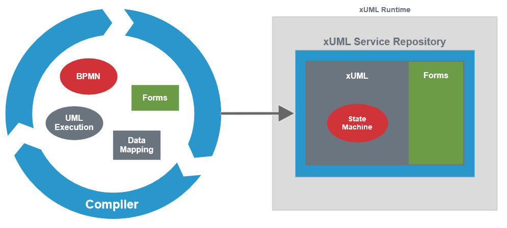 All that is compiled into a platform independent xUML service repository that translates the modeled logic into an UML state machine. This state machine handles the actual process.