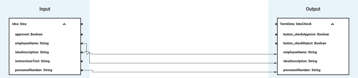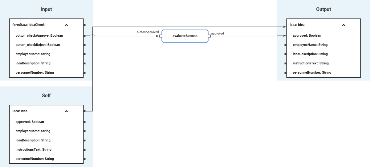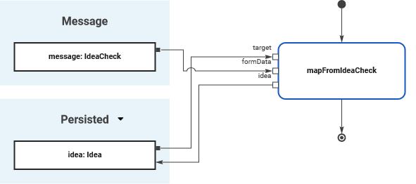 The example above shows an On Exit execution from the IdeaManagement example. Operation mapFromIdeaCheck implements a mapping diagram that maps the form data to the persisted idea.