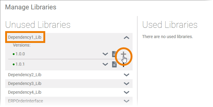 Especially if you develop your own libraries (see Developing and Using Libraries for details) and create different versions, it is possible that library dependencies conflict with each other when you add them to a service.
