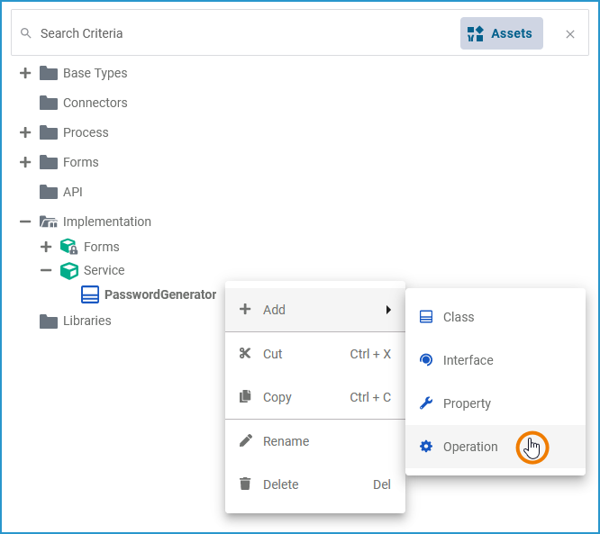 Alternatively, you can add a class operation via the context menu of a class, and create an implementation afterwards. Right-click the class you want to add an operation to and select Add Operation from the context menu: