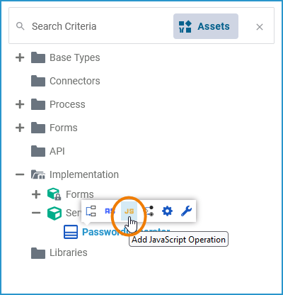 The fastest way to create an JavaScript operation is via the quick actions of the related class. Hover over the class you want to add the operation to, and use quick action Add JavaScript Operation: