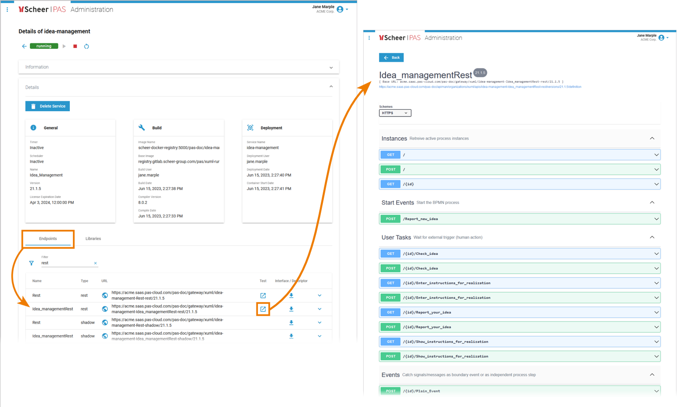 The BPMN process itself also has a dedicated REST API to gather information on dedicated process instances and their state(s), and to trigger transitions. Access to this interface is available via the service details in the PAS Administration, section Details > tab Endpoints: