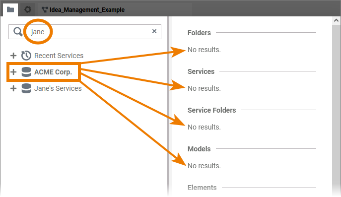 Click into the search box and enter your search term. While typing, the service tree is filtered automatically. Only matching elements are displayed and the hits are highlighted in the tree. Up to 100 hits can be displayed in the service panel. If you search criteria match more than 100 items, a note is shown below the search box. In that case, refine your search: