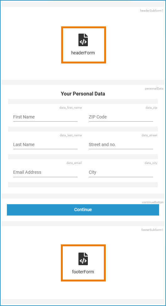We repeat the previous step for the footer in inputForm1 and assign the footerForm. The name of the assigned forms is displayed within the subform elements: