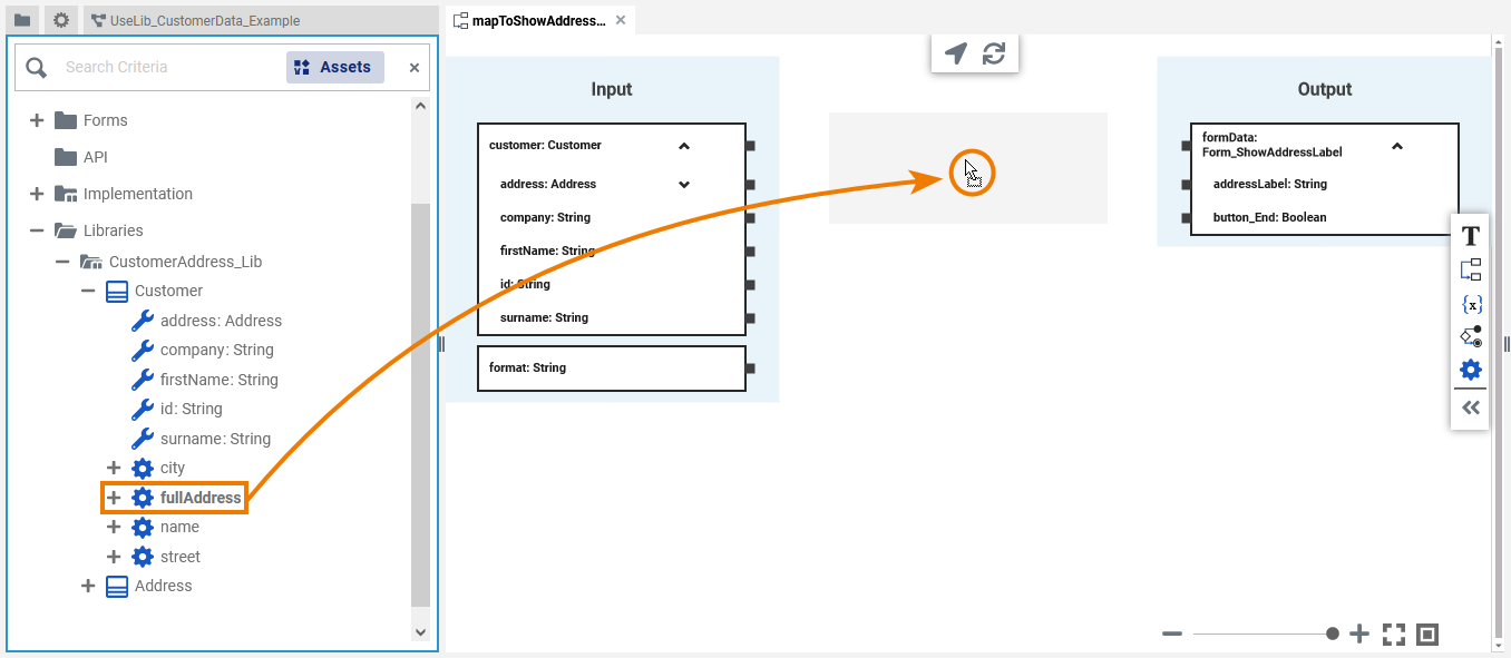 You can use classes, interfaces and operations from the library like any other element of your service data model from the Implementation folder, e.g. by dragging them to an implementation.