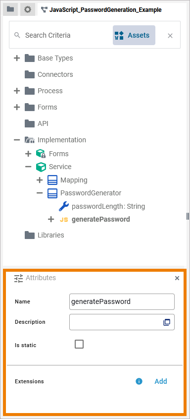 Select a JavaScript operation in the Implementation folder of the service panel to display its attributes in the Attributes panel. You can also edit them there: