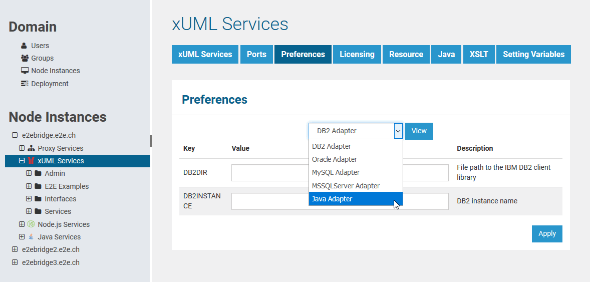 In the Navigation, select the Bridge item of the node instance you want to define the Java preferences for (in this example e2ebridge.e2e.ch) and switch to tab Preferences.