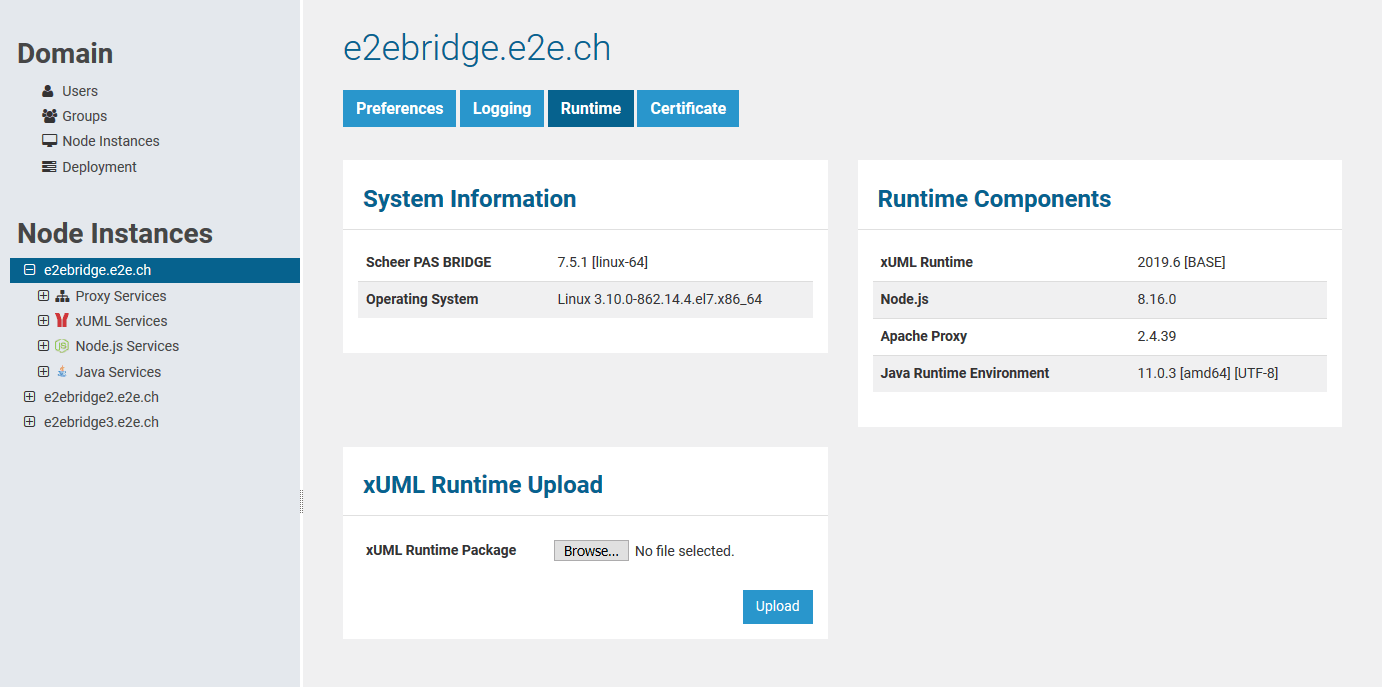 The welcome page is displayed.Select the node instance you want to upload the libraries to (in this example e2ebridge.e2e.ch). If any xUML services are running, stop them first.