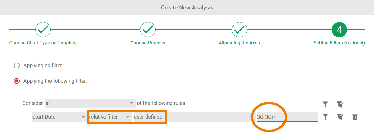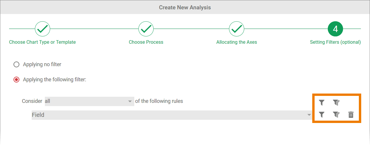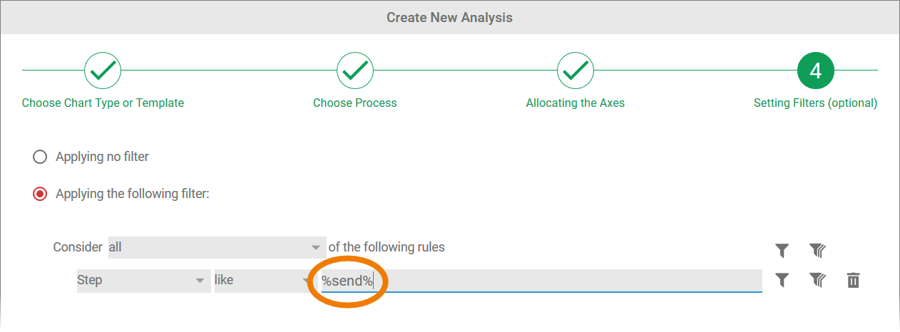 In step 4 of the wizard, the option Applying no filter is selected by default. This means that all instances of the process selected are evaluated in the analysis.