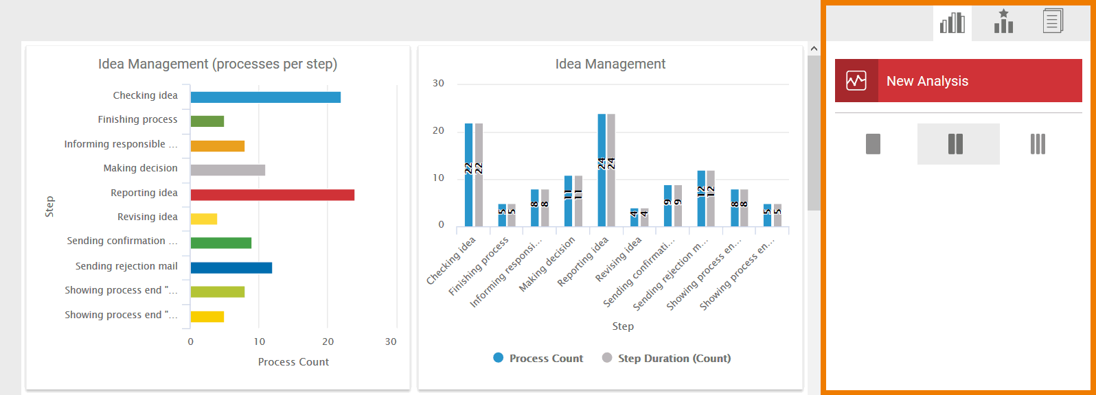 Process mining enables the creation of individual evaluations based on your key process data. You decide yourself how you want the analyses to be shown: Choose the most suitable chart type for your analysis from a range of different options. You can also use the sidebar to analyse the differing variants that your process goes through and to create templates for analyses that are required on a frequent basis.