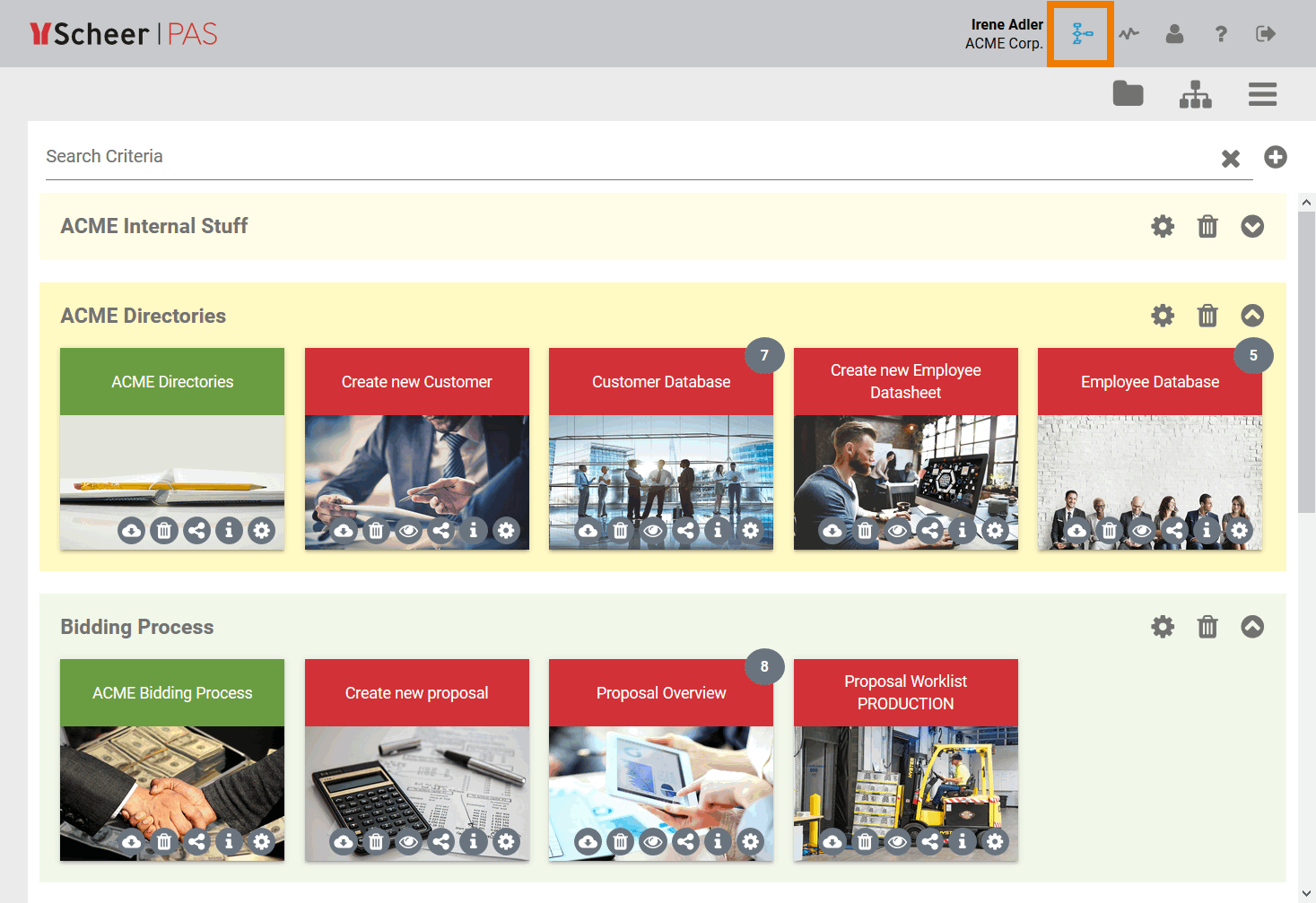 Projects and process apps are managed in user-defined groups via the cockpit; interface tiles allow direct access to the apps. The creation of external links also makes direct access to external websites possible from the cockpit: For example, one’s own integration component (Bridge) can be opened directly from the cockpit with just one click.